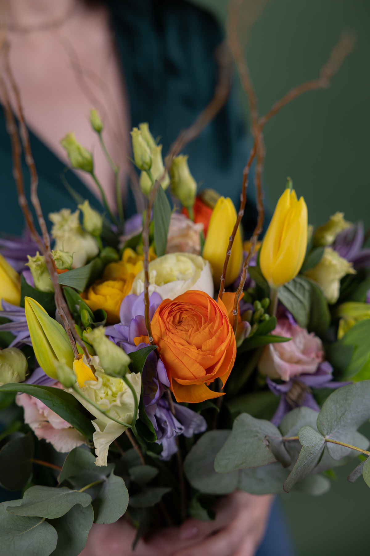 Bouquet naturale e arioso con fiori freschi misti di stagione ed eucalipto nei toni giallo, arancio e lilla. Ideale come mazzo elegante o idea regalo floreale.