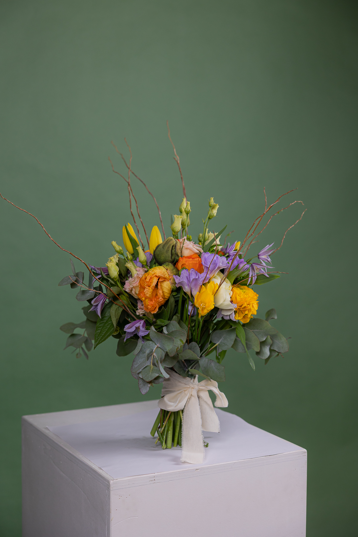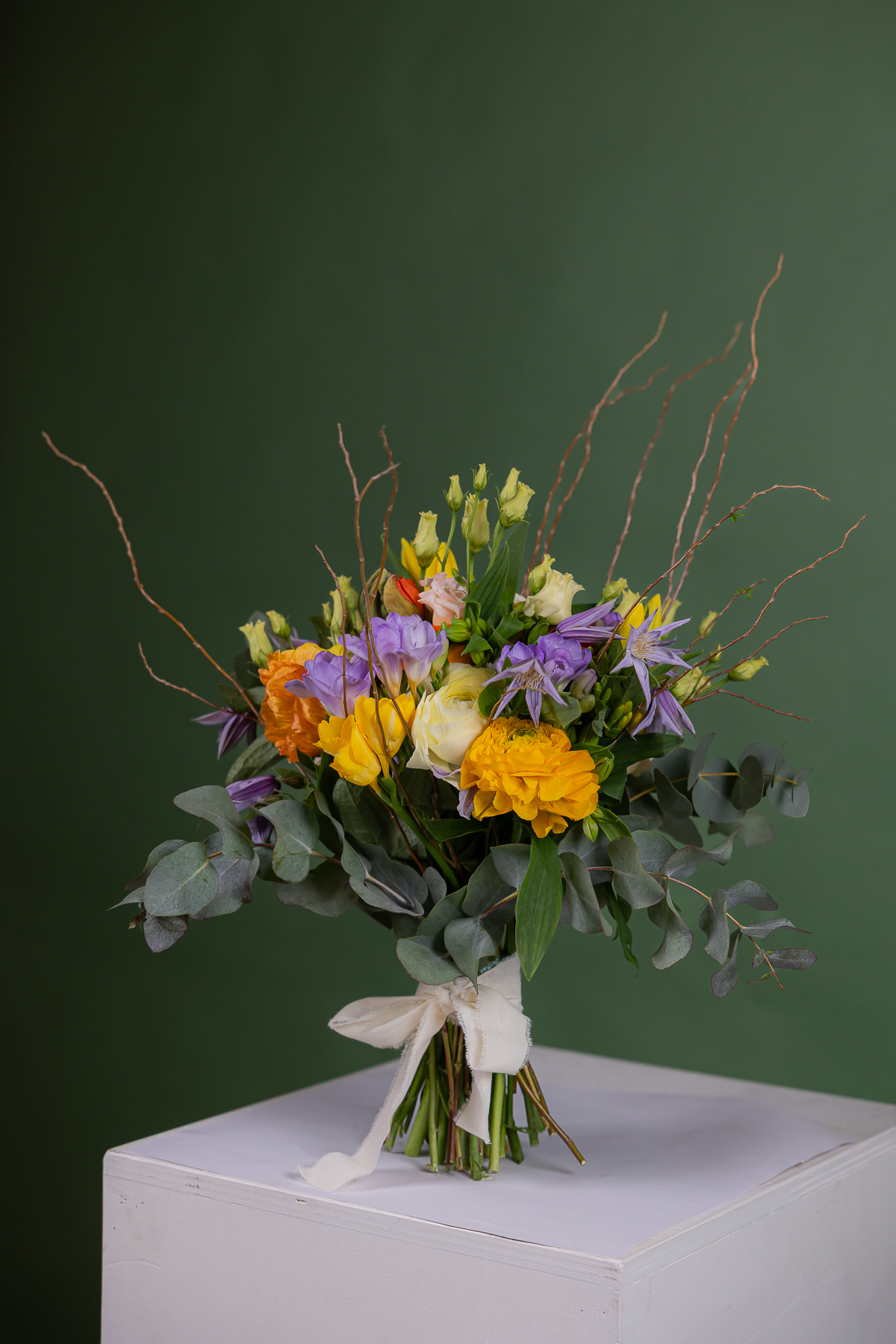 Bouquet naturale e arioso realizzato con fiori freschi misti di stagione ed eucalipto nei toni giallo, arancio e lilla. Perfetto come mazzo di fiori elegante o idea regalo floreale.