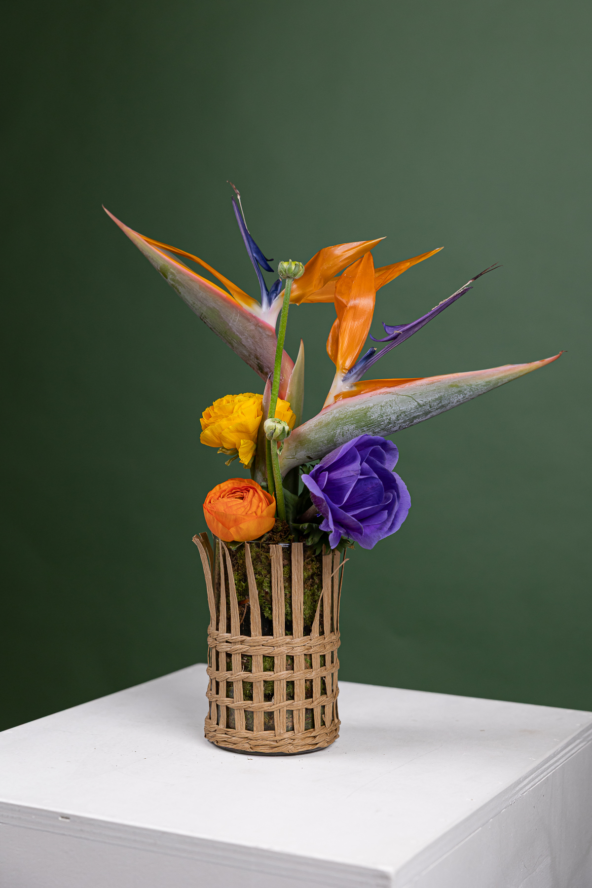 Centrotavola Esotico è una composizione floreale moderna e vivace con strelitzia, ranuncoli e anemoni nei toni arancio, giallo e viola, ideale come centrotavola originale o idea regalo.